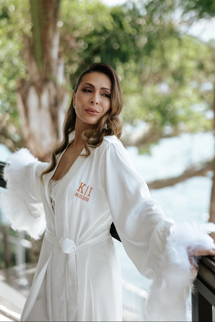Robe Paola Branco Longo com Plumas para Noivas Fashion