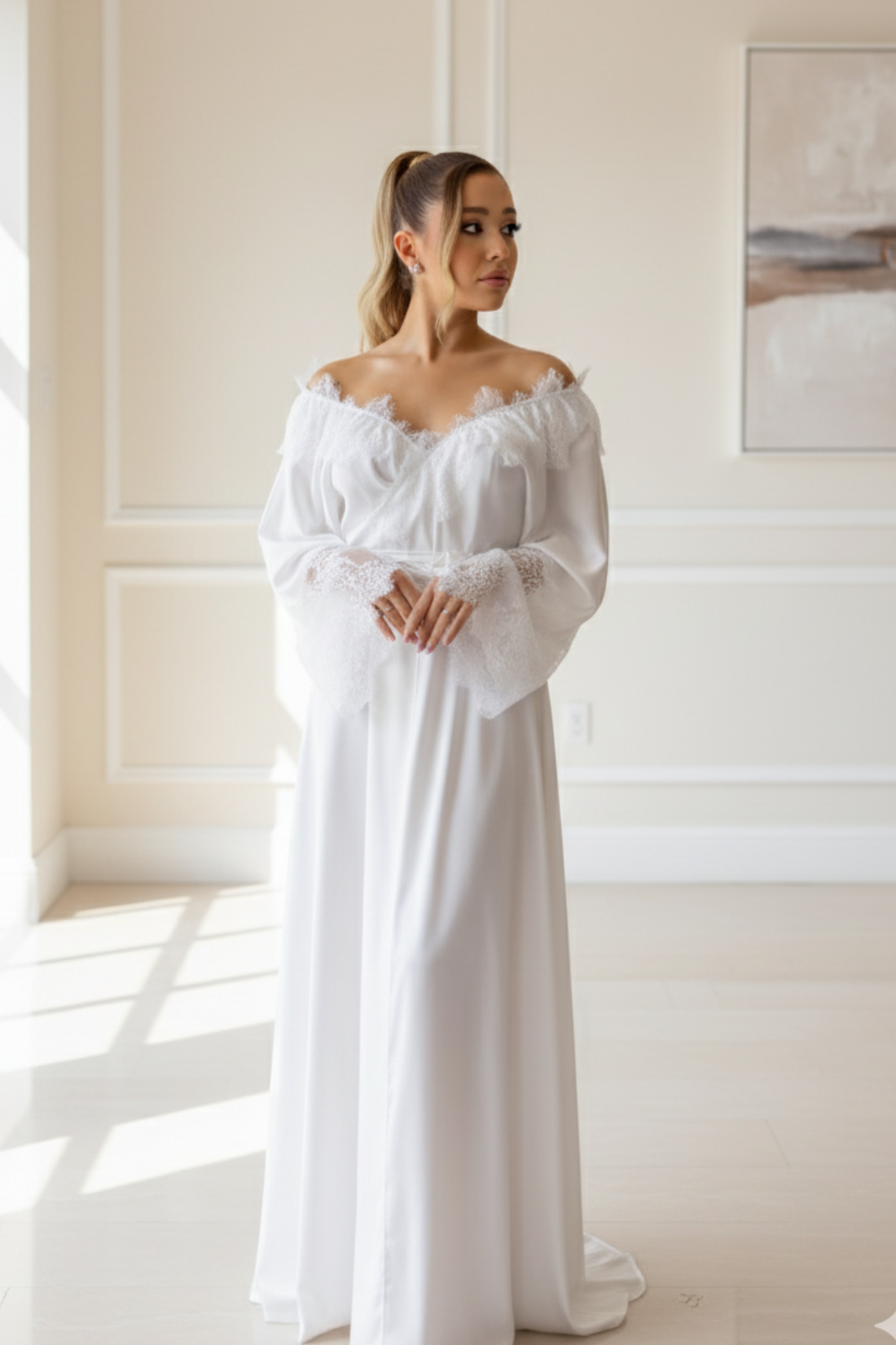 Com caimento fluido e comprimento que traz movimento e sofisticação, o robe longo proporciona uma presença única nas fotos do making of, além de garantir conforto durante os preparativos. Ideal para noivas que amam um toque de glamour sem abrir mão da leveza, ele está disponível em diferentes acabamentos, como tule, renda, pluma ou com detalhes especiais.