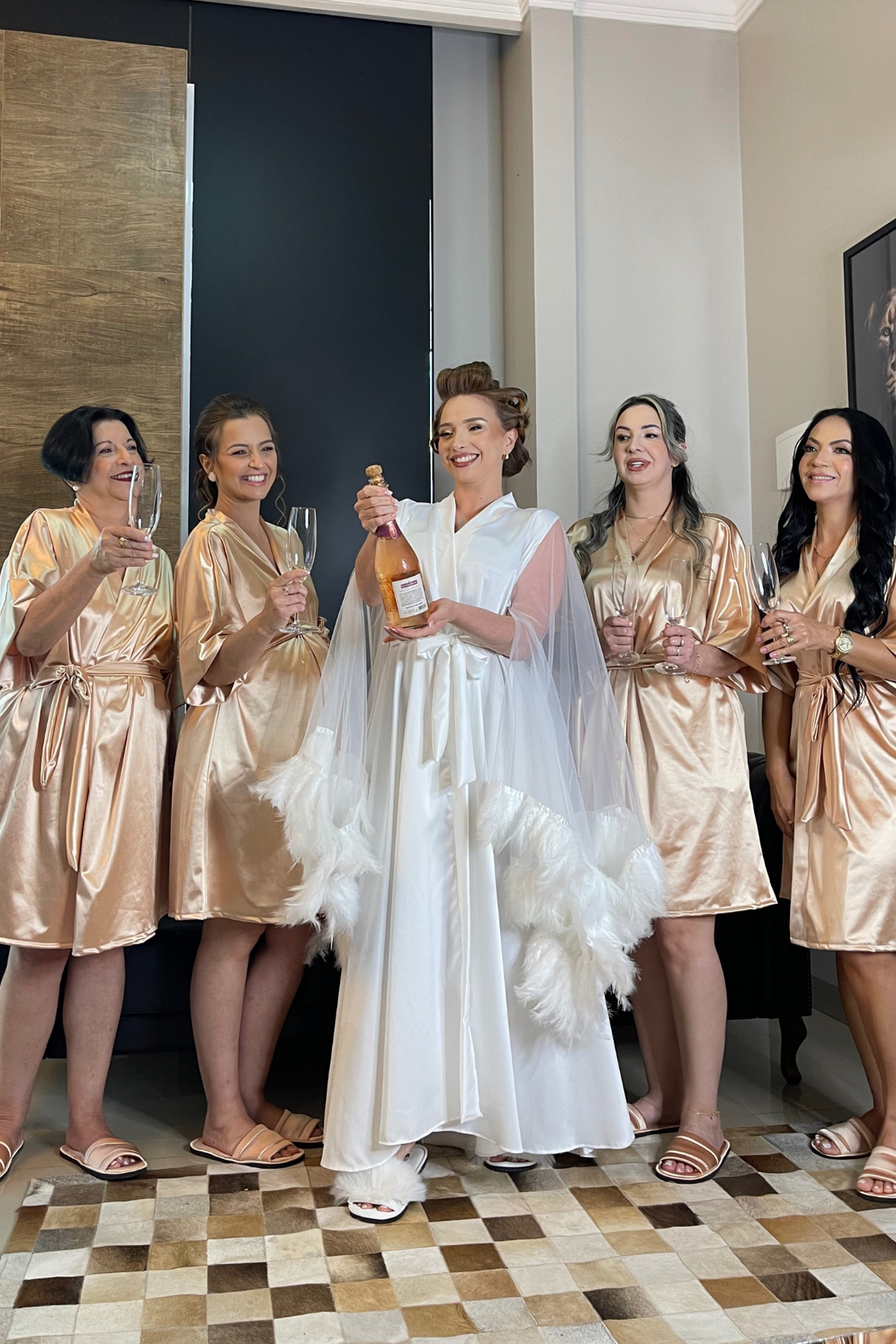 Durante o making off, traz praticidade, protege o vestido e ainda coloca todas em sintonia para as fotos, criando uma atmosfera de harmonia e cumplicidade. Cada clique se transforma em uma lembrança inesquecível ao lado da noiva, e quando personalizado, o robe ganha ainda mais significado, tornando-se uma recordação exclusiva desse dia tão especial. Afinal, ser madrinha ou mãe é estar presente em cada detalhe, e o robe faz parte dessa história de amor e celebração.