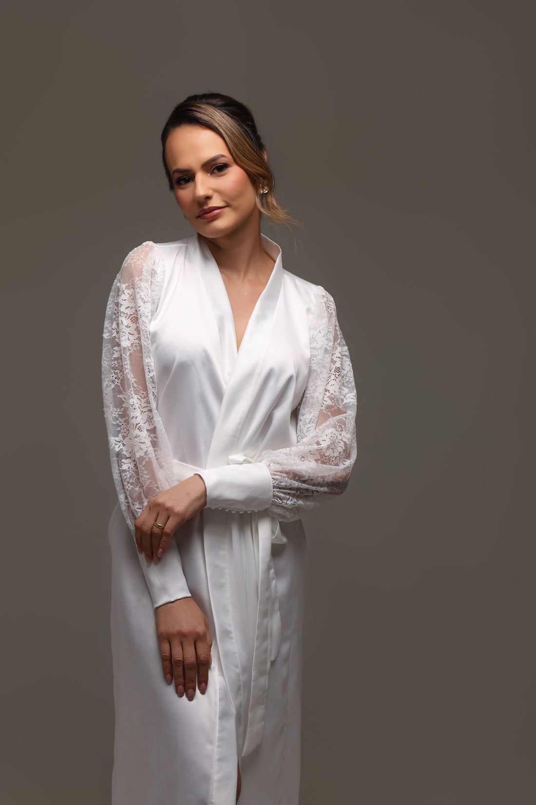 Simplicidade que encanta o robe com base reta é ideal para noivas que preferem um visual clean, confortável e elegante nos preparativos do grande dia.