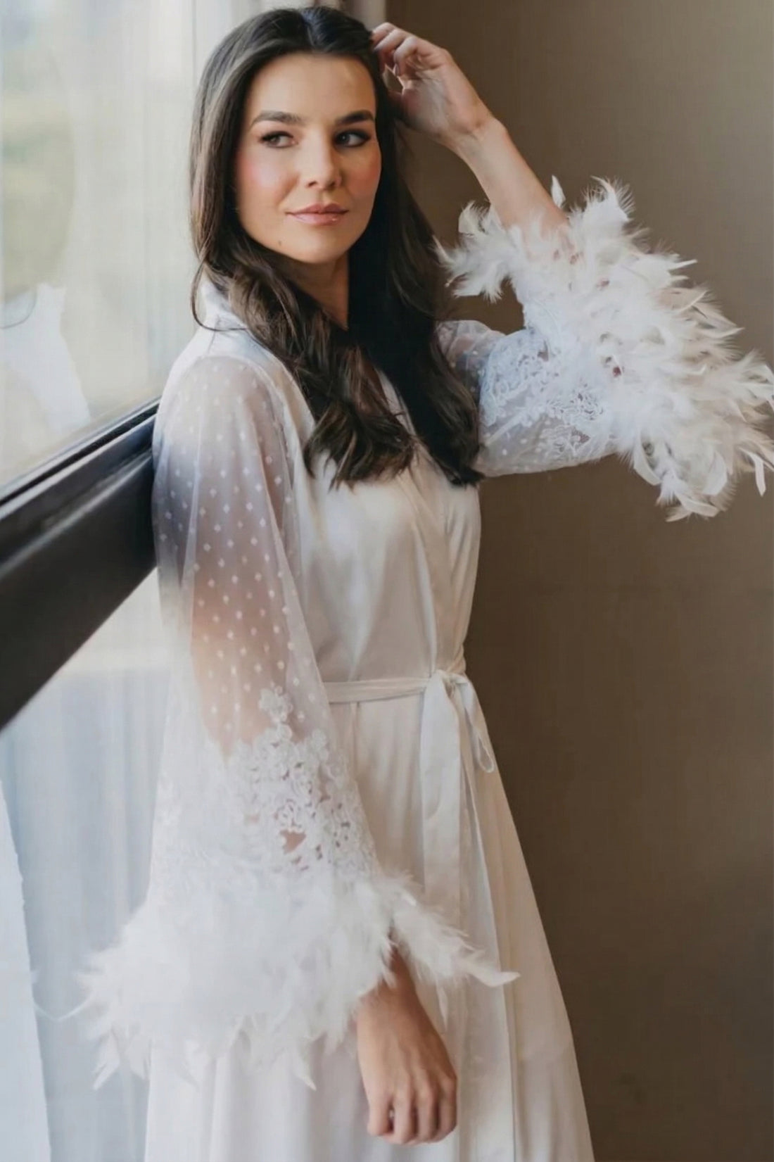 Robe Simone Longo com Mangas em Tule Poá e Plumas para Noiva Fashion