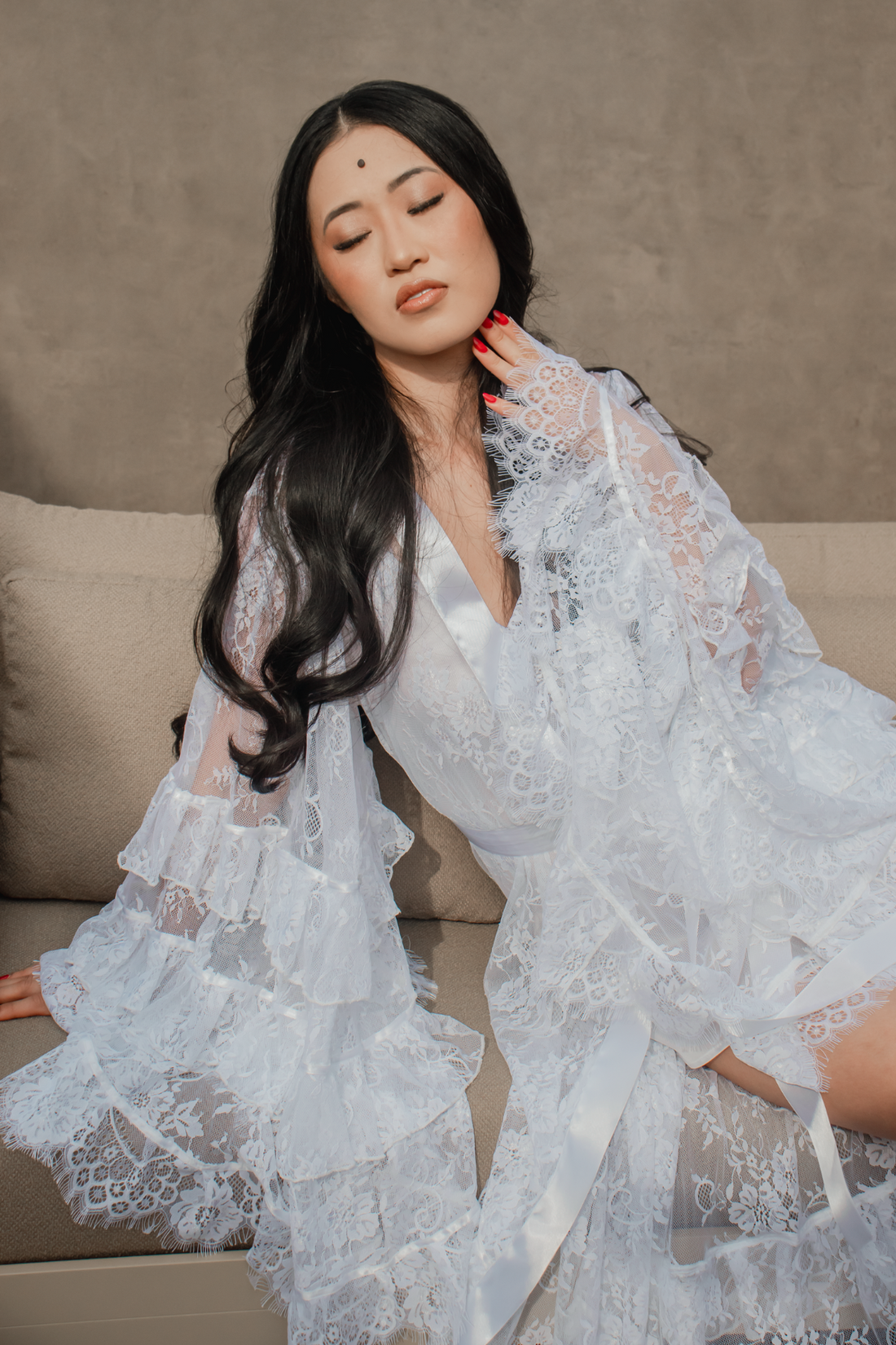 Confeccionado em tecido leve e confortável, ele se destaca pelas mangas em tule transparente, que criam um visual suave e etéreo, perfeito para o making of. O contraste entre a transparência das mangas e o corpo do robe traz equilíbrio entre charme e discrição, garantindo fotos delicadas e memoráveis.