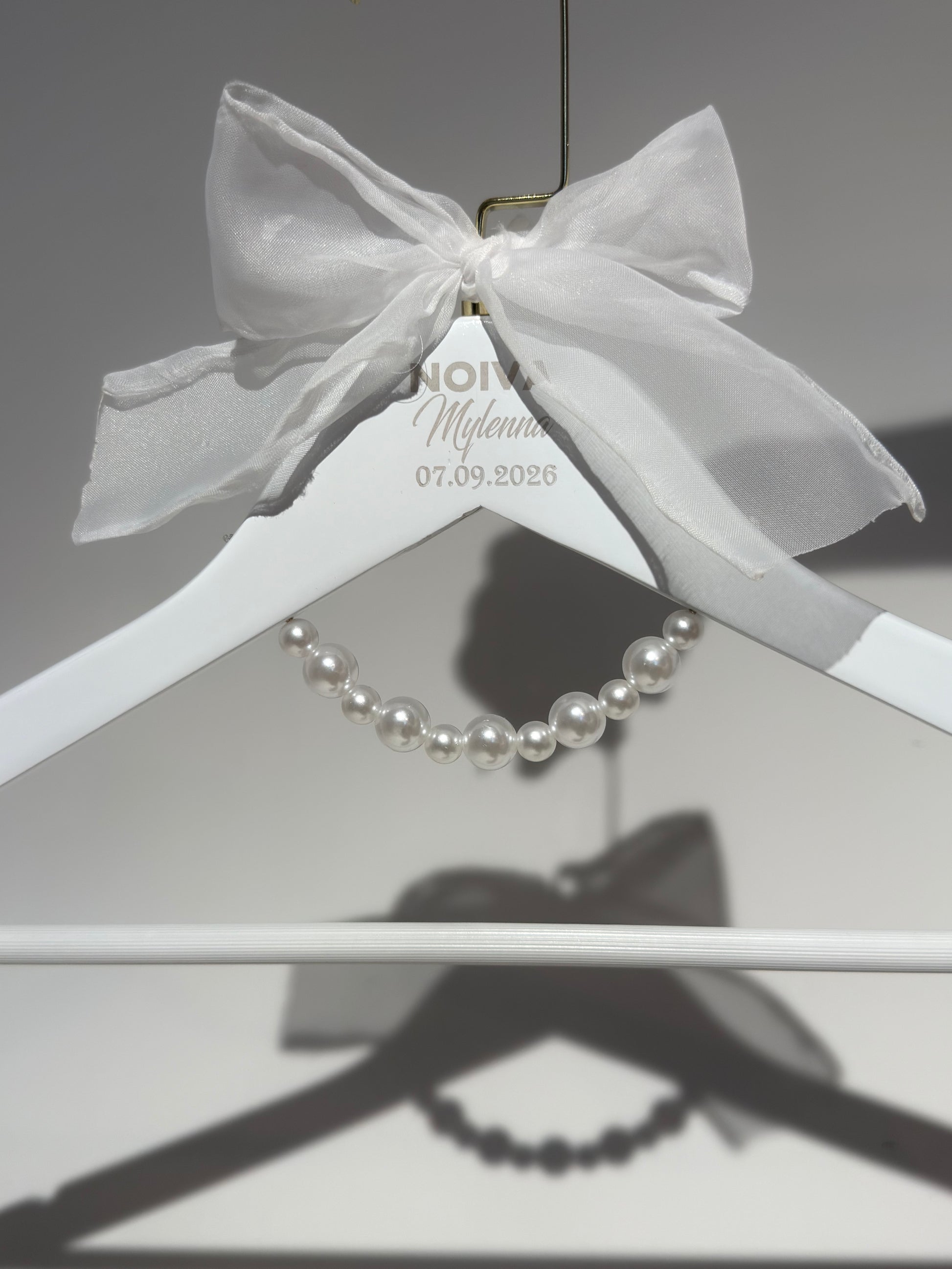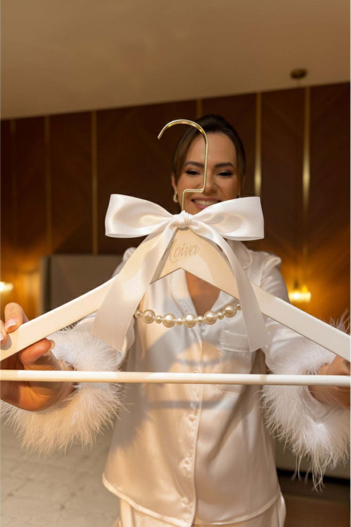 Material MDF laqueado de alta qualidade, com acabamento acetinado branco perolado que garante brilho suave e toque liso. Gancho em metal cromado resistente com rotação livre e detalhe em pérolas decorativas na base. Laço em fita de cetim dupla face com brilho delicado. Ideal para aquele charme nos robes e vestidos de noiva. |