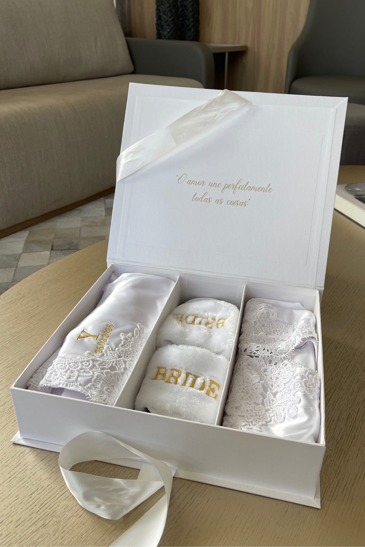 - Caixa com três repartições, sendo uma para robe outra para pantufa e a terceira para um produto pessoal, não enviado pela loja.
