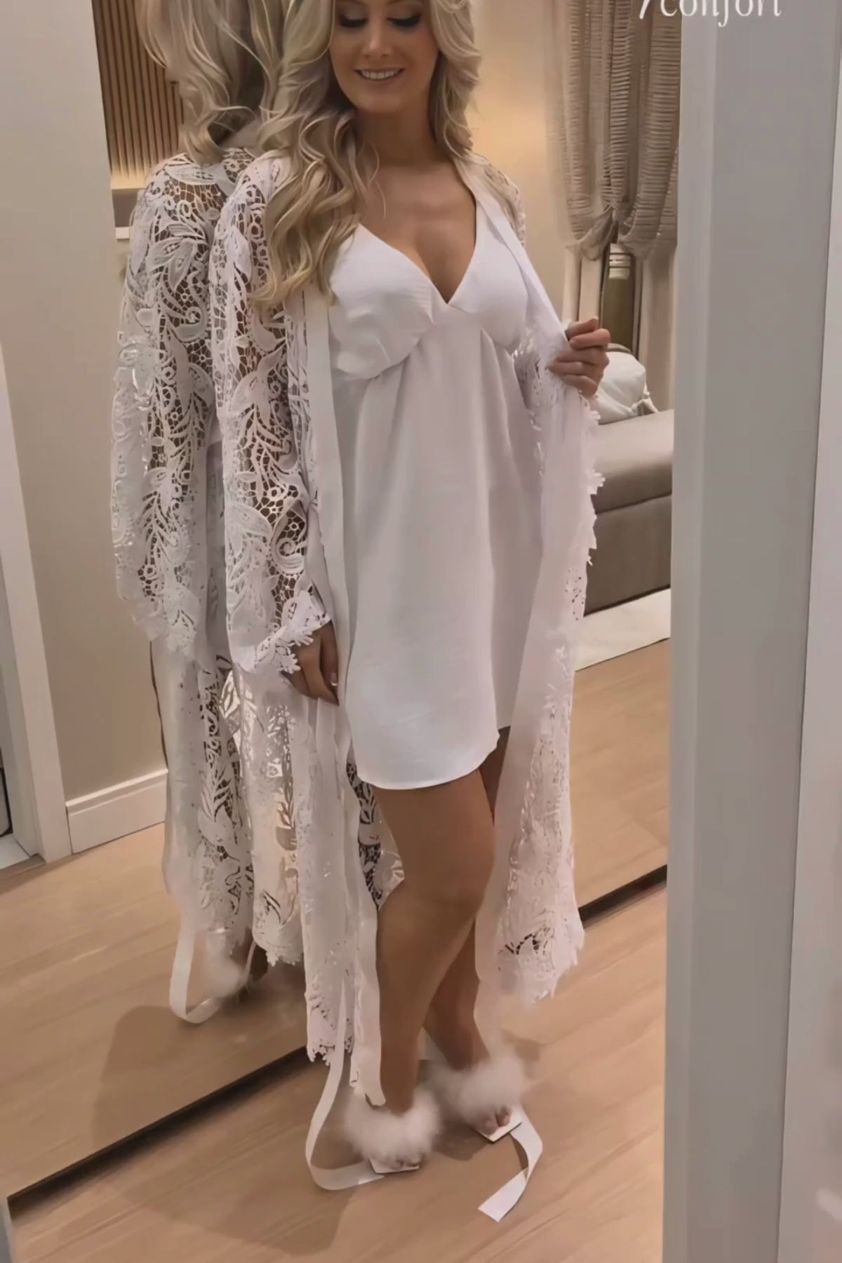 Nos momentos que antecedem o tão esperado “SIM”, a noiva deve estar envolvida por confiança, conforto e elegância. A camisola, usada sob o robe, garante toque suave e aconchegante, oferecendo a segurança ideal para que cada detalhe dos preparativos seja vivido com leveza e serenidade.