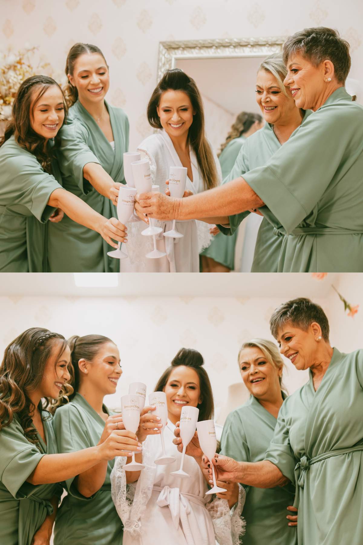 No making off, madrinhas e mães ganham destaque com o robe, que une praticidade, conforto e sofisticação. Além de facilitar os preparativos, garante delicadeza nos momentos de brinde e torna as fotos memoráveis.