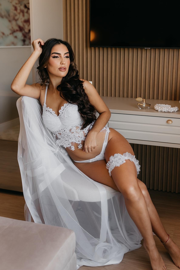 É ideal para a noite de núpcias, combinando sensualidade, delicadeza e sofisticação. O sutiã com renda valoriza o busto com um toque romântico, enquanto a calcinha de renda traz charme e feminilidade ao visual. Para completar, o conjunto acompanha liga de perna, um detalhe clássico e irresistível que adiciona ainda mais elegância e sensualidade ao momento. Em tom branco, é a escolha perfeita para uma noite inesquecível.