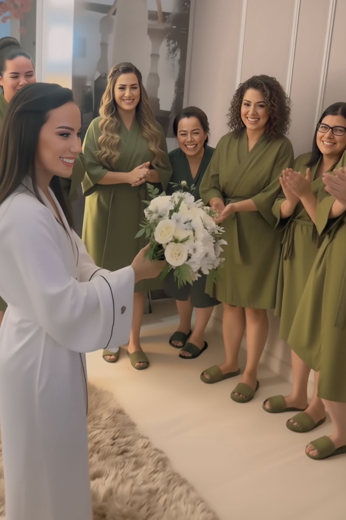 As madrinhas merecem conforto e elegância no grande dia! As pantufas são perfeitas para o making of, proporcionando bem-estar durante os preparativos e garantindo fotos harmoniosas ao lado da noiva. Além de práticas e higiênicas, criam um visual uniforme e cheio de carinho entre o grupo. Um detalhe que une conforto, beleza e lembrança especial desse momento inesquecível.