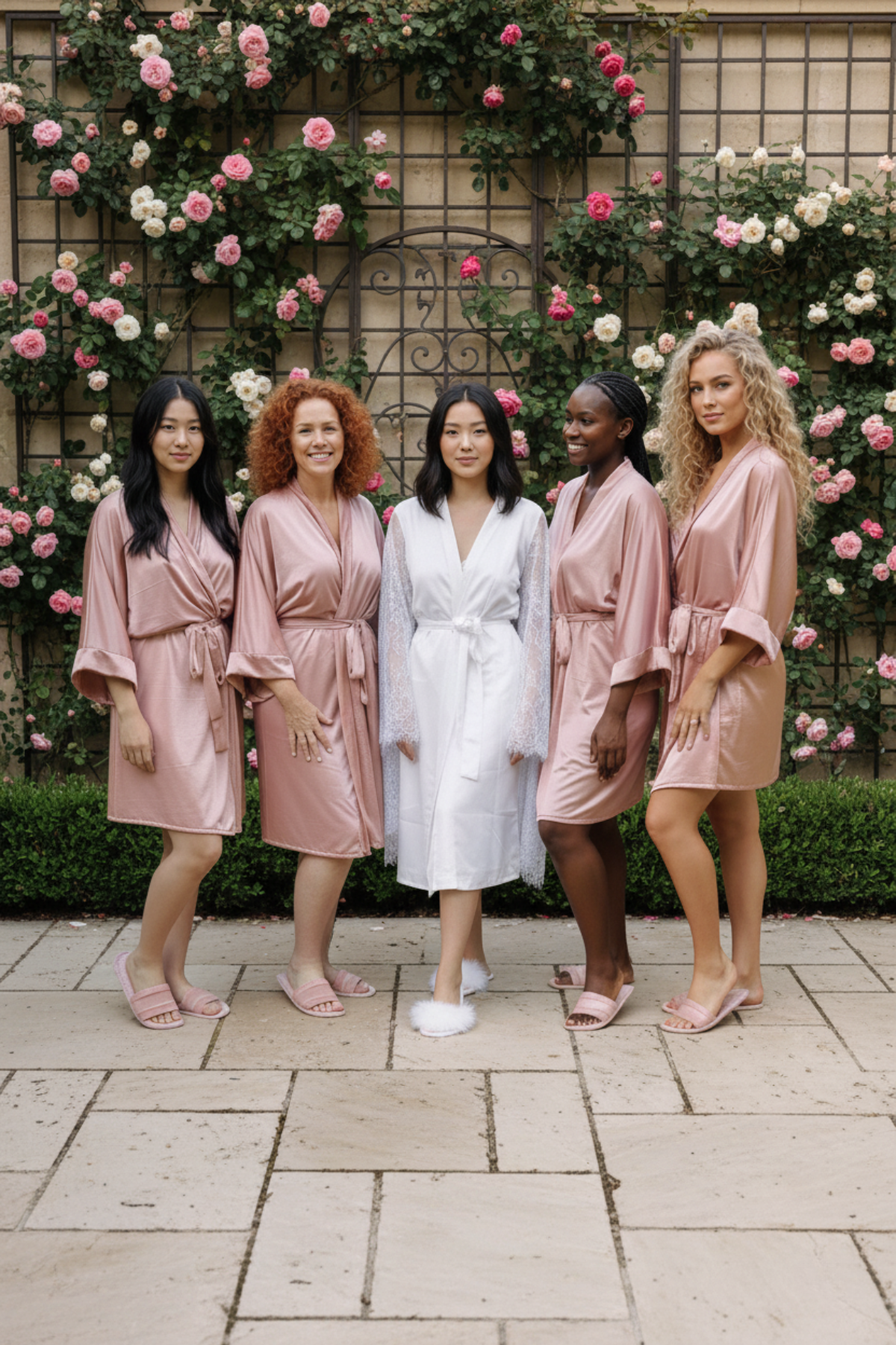 O Robe Rosê Ostensa é a escolha perfeita para madrinhas e noivas que desejam unir romantismo e elegância. Confeccionado em tecido acetinado que parece cetim, mas não amarrota, oferece leve brilho e toque macio. Sua modelagem kimono com mangas amplas e punhos dobrados garante conforto e sofisticação, enquanto a faixa ajustável valoriza a silhueta. O caimento fluido traz charme às fotos do making of, e a cor rosê traduz amor, ternura e feminilidade em cada detalhe.