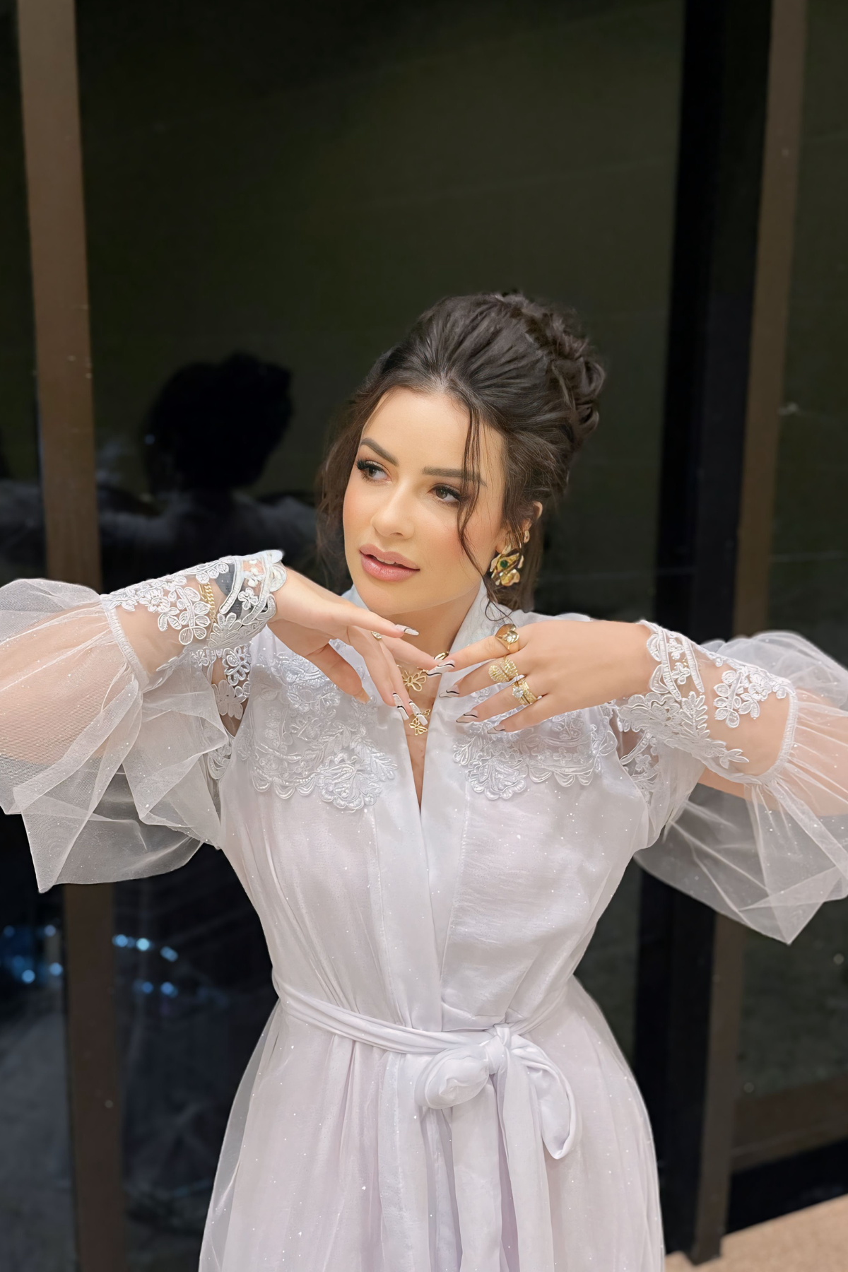 Antes do tão esperado “sim”, existem momentos repletos de emoção e o robe de noiva está presente em cada um deles. Entre sorrisos discretos e os toques finais da maquiagem, ele compõe o cenário do making of com charme e delicadeza. Mais que uma peça, é um abraço suave nos bastidores de um dos dias mais marcantes da vida.