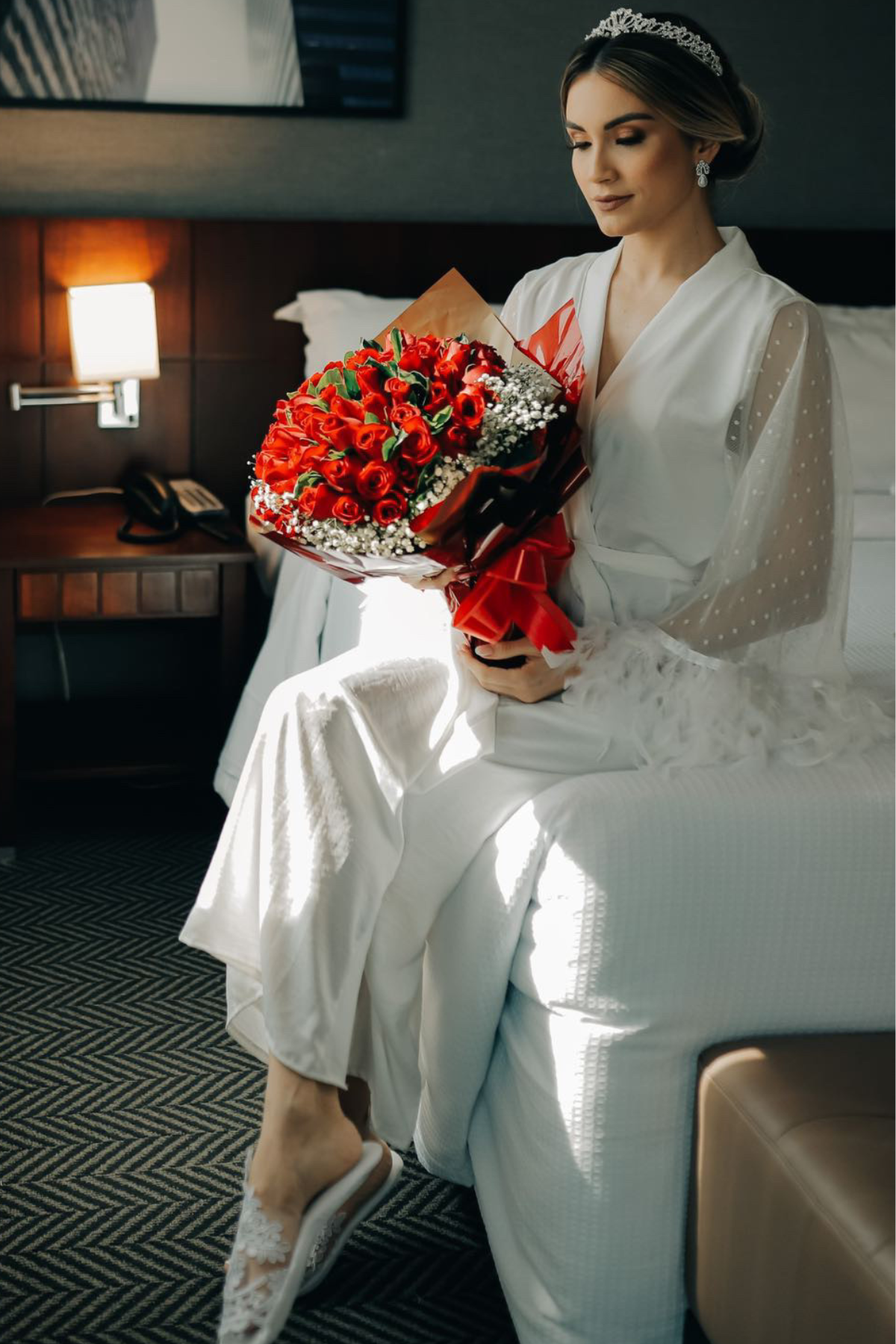 Nas primeiras horas do dia mais especial, o conforto ganha protagonismo. O robe envolve a noiva com um toque leve e macio. Cada detalhe do tecido fluido ao caimento delicado foi pensado para oferecer bem-estar sem abrir mão da beleza. Mais do que vestir, ele proporciona um momento de pausa e aconchego antes do “sim”