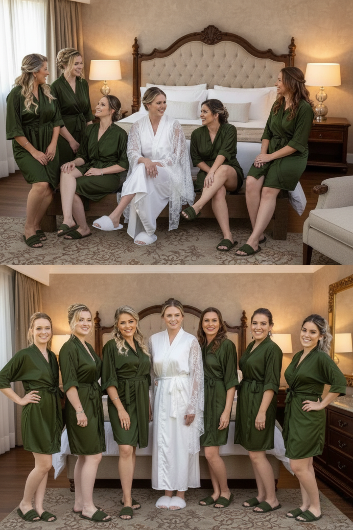 Perfeito para madrinhas, mães de noiva e sogra, o robe verde oliva traz elegância e harmonia ao making of.